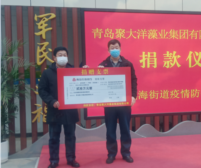 2月11日,聚大洋集團(tuán)和個(gè)人共捐款24萬余元,其中集團(tuán)公司向區(qū)慈善總會(huì)定向捐款人民幣20萬元,用于濱海街道辦事處疫情防控,全體職工共捐款4萬余元。