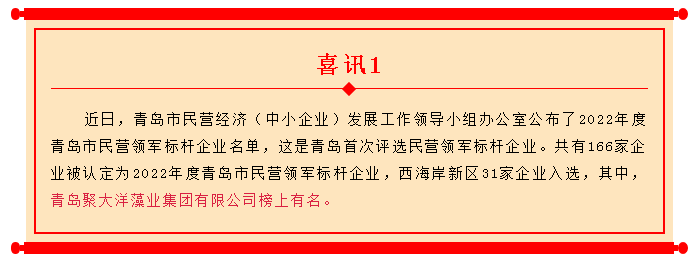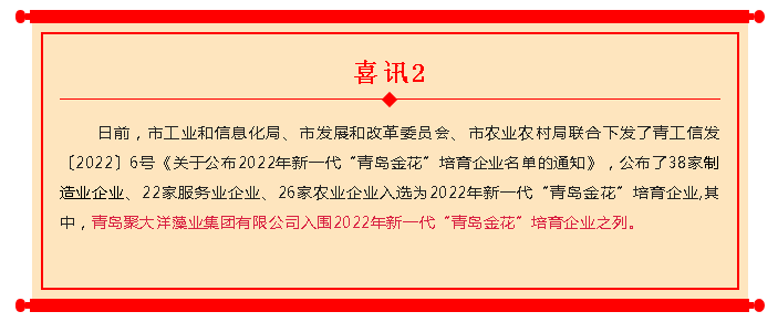 聚大洋集團(tuán)將以此為契機(jī),立足新發(fā)展階段,完整、準(zhǔn)確、全面貫徹新發(fā)展理念,融入新發(fā)展格局,全力實(shí)施“兩園一基地”建設(shè),立足海藻加工主業(yè),做強(qiáng)海藻綜合加工專業(yè),陸海統(tǒng)籌,堅(jiān)持發(fā)展海洋生物醫(yī)藥產(chǎn)業(yè),不斷推進(jìn)企業(yè)高質(zhì)量發(fā)展,為加快建設(shè)新時(shí)代社會(huì)主義現(xiàn)代化國(guó)際大都市做出更大貢獻(xiàn)。