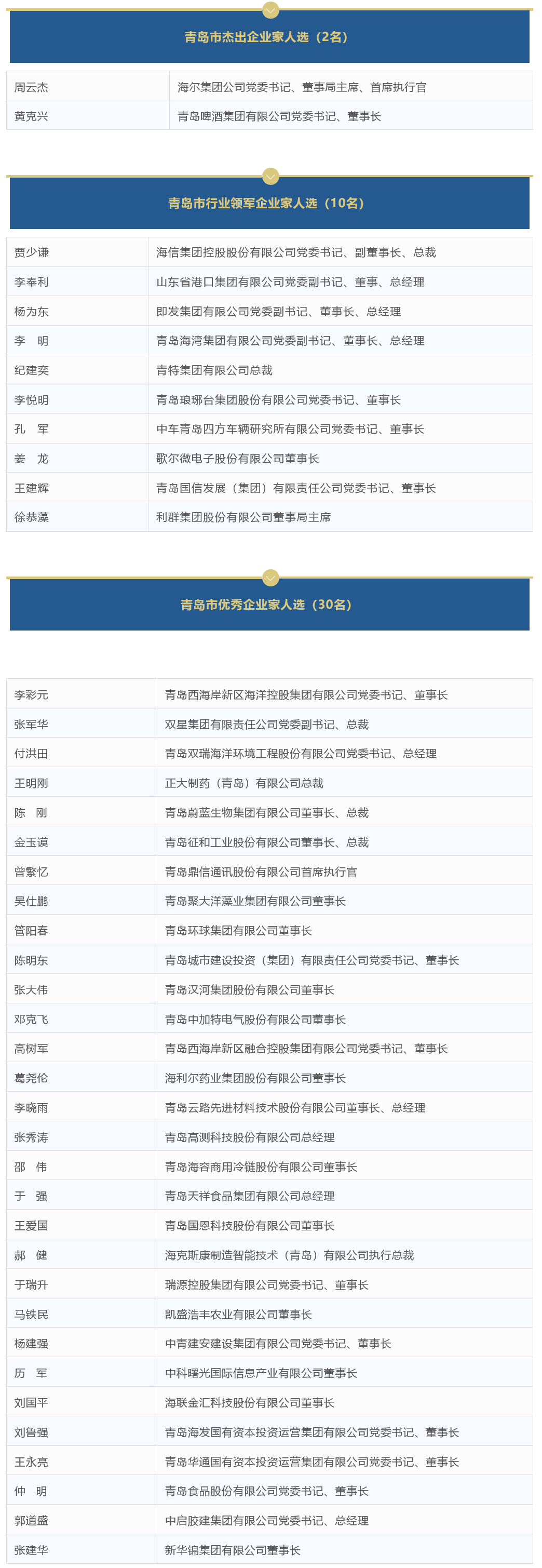 2022年度評選出的首批企業(yè)家中,“青島市杰出企業(yè)家”獲得者分別為海爾集團(tuán)公司黨委書記、董事局主席、首席執(zhí)行官周云杰,青島啤酒集團(tuán)有限公司黨委書記、董事長黃克興。