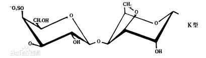由硫酸基化的或非硫酸基化的半乳糖和3,6-脫水半乳糖通過α-1,3糖苷鍵和β-1,4鍵交替連接而成,在1,3連接的D半乳糖單位C4上帶有1個(gè)硫酸基。分子量為20萬以上。分子式:(C12H18O9)n